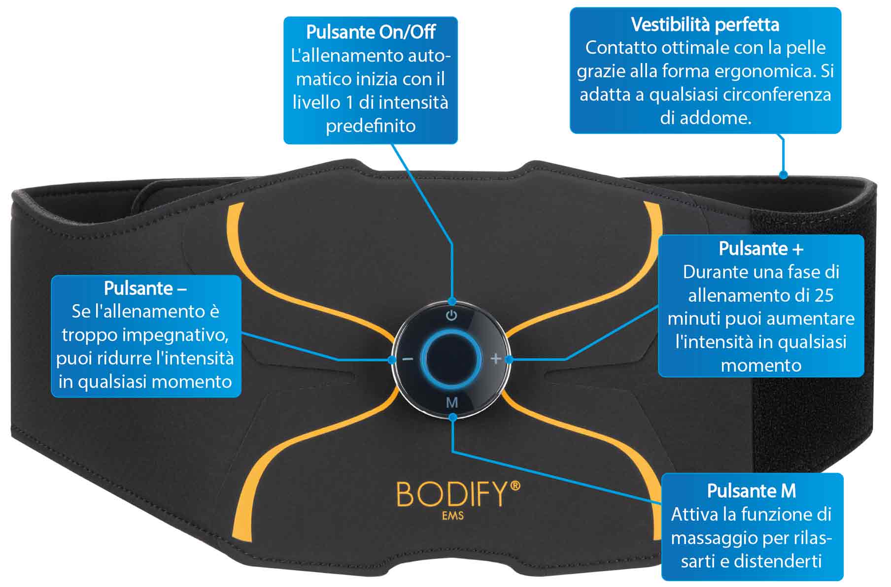 Bodify utilizza impulsi elettrici a bassa frequenza per generare contrazioni muscolari – un processo simile a quello che avviene durante l’attività fisica. In questo modo, la muscolatura può essere attivata localmente.